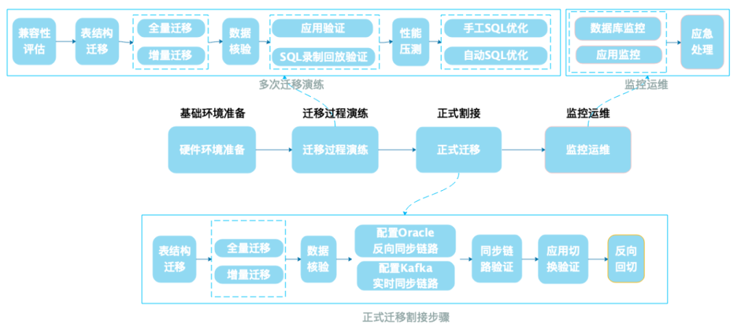 针对传统核心复杂的数据库情况进行全面验证,最终形成了140页的迁移操作手册和详细的割接行事历,为后续系统的迁移和大面积推广积累了宝贵的经验,并形成了标准的迁移割接方案。整体迁移方法过程如下,从基础环境准备-迁移过程演练-正式割接-监控运维等四大环节进行逐项拆解,落实到人,精确到分。
