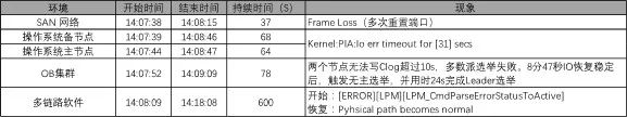 经过深入分析,发现是SAN存储交换机到核心交换机连接的一个端口出现了故障。虽然配置了多路径转发,但由于操作系统内核的超时时间OceanBase切主时间不匹配,触发了OceanBase的自动选主操作。而选主过程中,另外一台物理机也走的同样端口也出现了IO阻塞的问题,最终导致OceanBase进入无主状态,当多路径软件成功切换后,OceanBase未经过任何干预就完成了自动恢复。本质上是因为软件超时参数与硬件超时参数不匹配所导致,也是软硬件系统磨合不够充分的表现,通过相关参数的调整能减少RTO的时间。