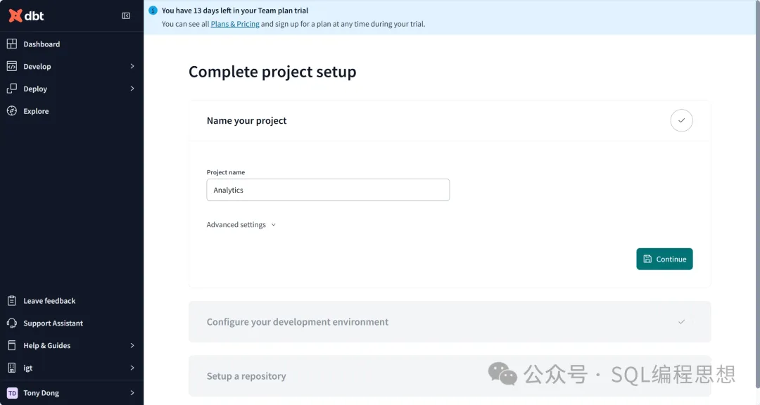 dbt Core:免费开源的 CLI 工具,支持命令行形式开发和运行 dbt 项目。dbt Cloud:基于 Web 的托管服务,提供 UI 界面以及各种企业级功能;对个人开发者免费。云服务器提供商dbt Cloud输入以下网址并注册一个免费账号: