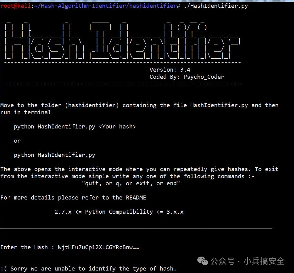 复制git clone https://github.com/AnimeshShaw/Hash-Algorithm-Identifier.git cd /Hash-Algorithm-Identifier/hashidentifier chmod +x HashIdentifier.py ./HashIdentifier.py1.2.3.4.5.输入值: