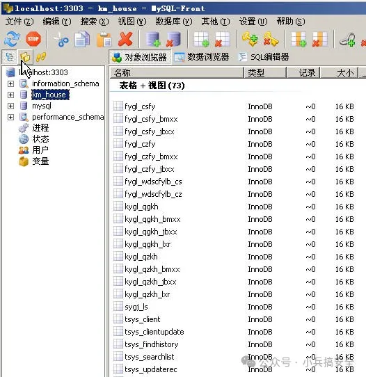 在服务端程序安装目录发现其运行有mysql数据库,运行端口为3303,通过查看mysql下的user.MYD获取其root账号密码为:3C71F7A211581537008603DBC9012B7991DD4830,解密后为ukicreator,通过sql front进行连接并查看数据库,如图3所示,查看了所有的表,未发现敏感配置信息。