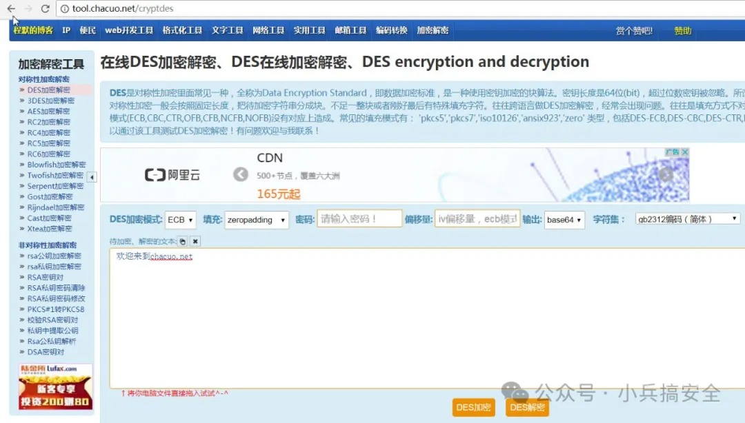 通过查找资料获取des等在线加解密站点http://tool.chacuo.net/cryptdes,但这些解密需要有一个key才行,无法通过在线网站直接解密,如图4所示。