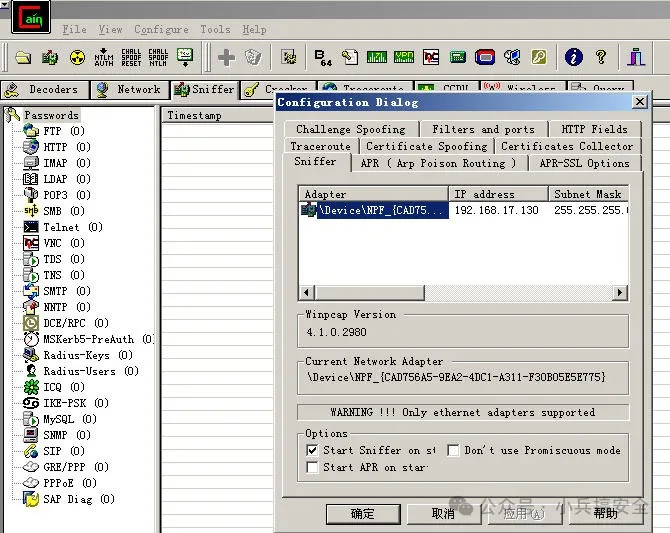 安装cain工具,最新版本为v4.9.56,下载地址http://www.oxid.it/downloads/ca_setup.exe,安装完毕后,设置监听地址,如图5所示,单击Configure,在其窗口中选择IP地址进行监听,然后再单击“网卡”和“核弹”标志图片开始嗅探。