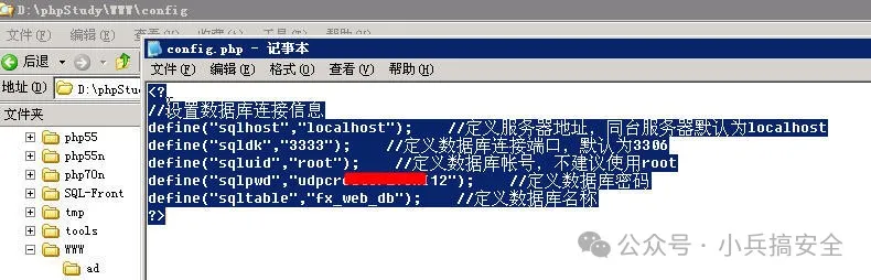 在服务器D盘下,成功获取数据库配置文件config.php,如图8所示,获取数据库端口为3333,root用户的密码为“udpcreator@!UKI12”,口令很强悍!