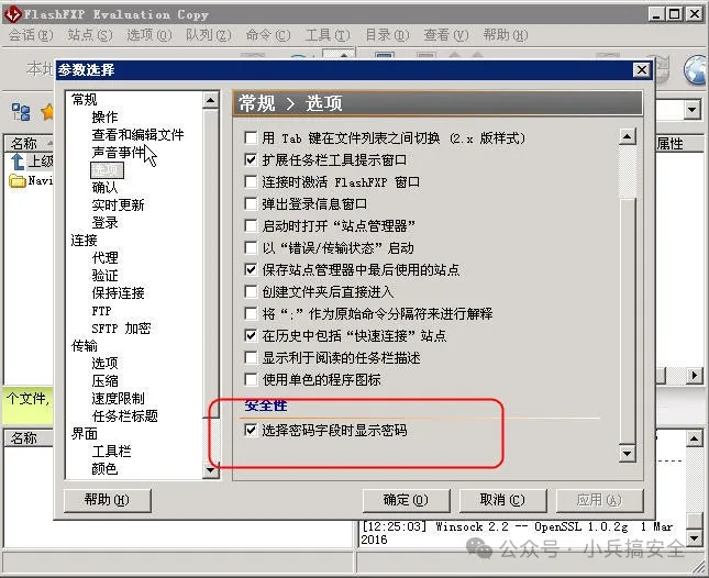 在系统中还发现安装了FlashFXP程序,运行该程序后,通过“选项”-“参数选择”-“选项”,在安全性中勾选“选择密码字段时显示密码”,如图9所示,确认后配置生效。