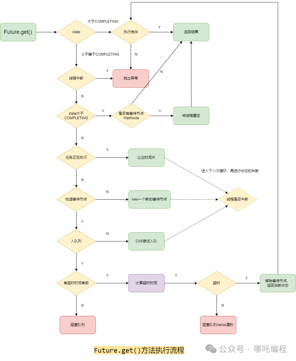如果处于EXCEPTIONAL以上状态,抛出异常。如果处于COMPLETING状态,加入AQS队列等待。如果处于NORMAL状态,返回结果。3、get()方法执行流程
