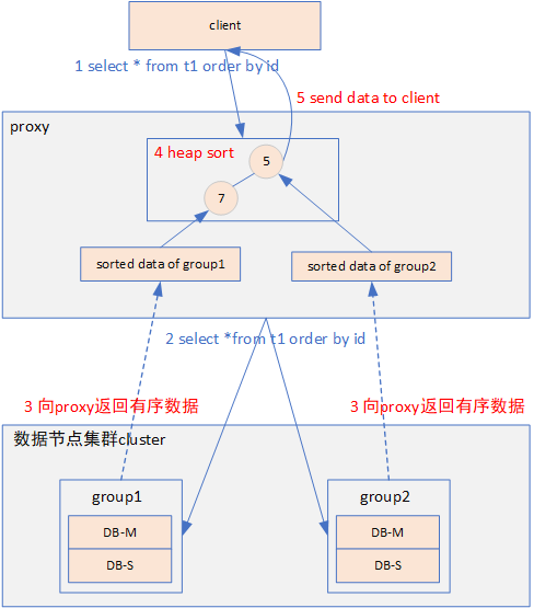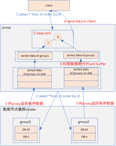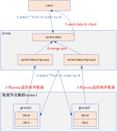 (1) client向proxy下发排序查询语句 select *from t1 order by id。