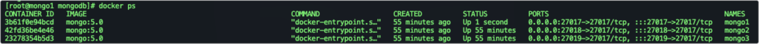 复制version: 3 services: mongo1: image: mongo:5.0 container_name: mongo1 restart: always ports: - "27017:27017" volumes: - ./data/mongo1:/data/db command: mongod --replSet rs0 --bind_ip_all --port 27017 mongo2: image: mongo:5.0 container_name: mongo2 restart: always ports: - "27018:27017" volumes: - ./data/mongo2:/data/db command: mongod --replSet rs0 --bind_ip_all --port 27017 mongo3: image: mongo:5.0 container_name: mongo3 restart: always ports: - "27019:27017" volumes: - ./data/mongo3:/data/db command: mongod --replSet rs0 --bind_ip_all --port 270171.2.3.4.5.6.7.8.9.10.11.12.13.14.15.16.17.18.19.20.21.22.23.24.25.26.27.28.29.30.31. ports:27017、27018、27019 分别为三个节点对外的端口volumes:将步骤 2 中创建的目录和容器内的站群服务器数据目录进行映射--replSet rs0:指定副本集的名称为 rs0--bind_ip_all:可以让 MongoDB 实例能够通过所有网络接口进行连接,包括本地主机、局域网和互联网。这通常用于在多个计算机之间共享 MongoDB 数据库,或在具有可用公共 IP 地址的环境中使用。5、在 mongodb 目录下执行 docker-compose up -d 进行容器的构建,成功后如下图:
