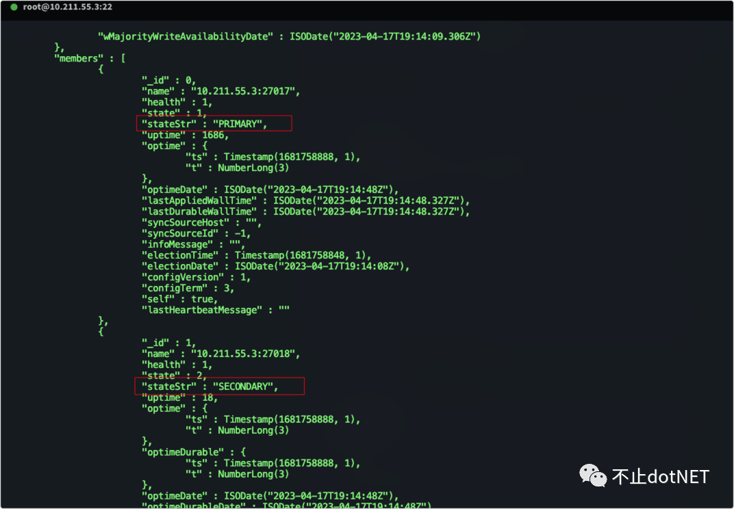 复制using MongoDB.Bson; using MongoDB.Driver; var mongoConnectionString = "mongodb://10.211.55.3:27017,10.211.55.3:27018,10.211.55.3:27019/test?replicaSet=rs0&readPreference=primary"; var mongoClient = new MongoClient(mongoConnectionString); var database = mongoClient.GetDatabase("test"); var collection = database.GetCollection<BsonDocument>("test"); // 插入一条文档 var document = new BsonDocument { { "name", "oec2003" }, { "age", 30 } }; collection.InsertOne(document); var documents = await collection.Find(Builders<BsonDocument>.Filter.Empty).ToListAsync(); foreach (var doc in documents) { Console.WriteLine(doc); }1.2.3.4.5.6.7.8.9.10.11.12.13.14.15.16.17.18. 连接字符串中的 replicaSet = rs0 用来指定副本集的名称。readPreference=primary ,将读取偏好设置为主节点,表示只从主节点读取数据,这也是默认模式,除了 primary 外,还有一些其他的配置选项,说明如下:readPreference=primaryPreferred:查询将首选主节点,但如果主节点不可用,则可以从其他节点读取数据。readPreference=secondary:查询将只从副本集的次要节点读取数据。如果没有次要节点可用,则查询将失败。readPreference=secondaryPreferred:查询将优先从次要节点读取数据,但如果没有次要节点可用,则可以从主节点读取数据。readPreference=nearest:查询将从网络延迟最低的节点读取数据。这个选项不考虑节点的角色(主节点或次要节点),而是选择网络最近的节点。在高可用部署中,一定要结合实际情况进行权衡后,采取既能解决问题,又驾轻就熟的方案,否则,出现问题,如果不能及时解决,效果还不如单机。