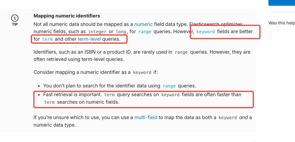 如果确定业务使用场景,建议keyword代替数值类型字段,如果不确定则采用多字段,keyword在term查询中性能更佳。