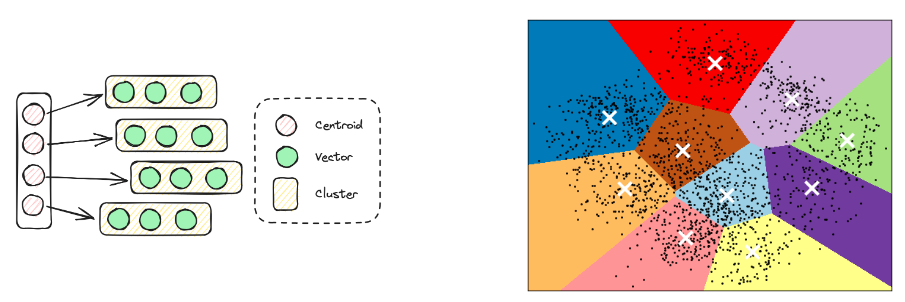 反向向量文件(Inverted Vector File,IVF)索引IVF索引会使用簇中心点作为其反转索引,从而有效地管理各种高维数据的查询。通常,它会根据几何邻近性,将向量划分为若干簇(Cluster),并将每个簇的中心点作为简化表示。在查询那些与查询向量最相似的项目时,该算法首先会识别与查询最接近的中心点。然后,它只在相关的向量列表中查询这些中心点,而不是整个数据集。与HSNW相比,IVF的构建时间更短,但查询过程中的准确率和速度则更低。