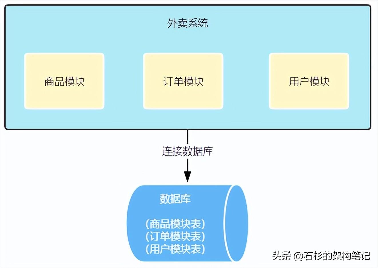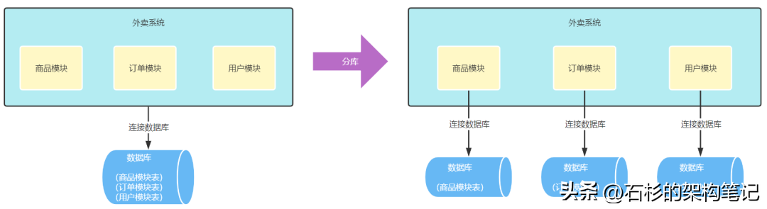 而且,系统扩展也会变的更容易一些,现在各个模块都拆分出来了,比如订单模块,就从外卖系统中,单独拆分出来一个模块了,这个订单模块的数据,在一个数据库中和其他模块的数据,就独立了。