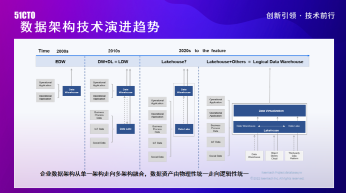 高经郡表示,企业数据架构具有从单一架构走向多架构融合,数据资产由物理性统一走向逻辑性统一的发展趋势。构建湖仓一体基础数据底座,保障企业多架构融合平台基础,从而助力企业构筑智能数据的新基石。