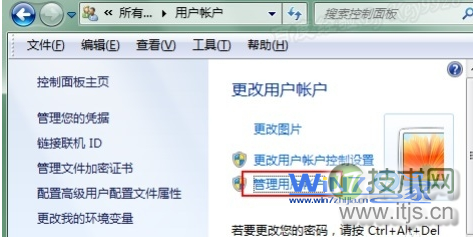 3、示输再弹出来界面中点击“管理用户账户”项;