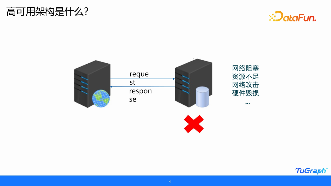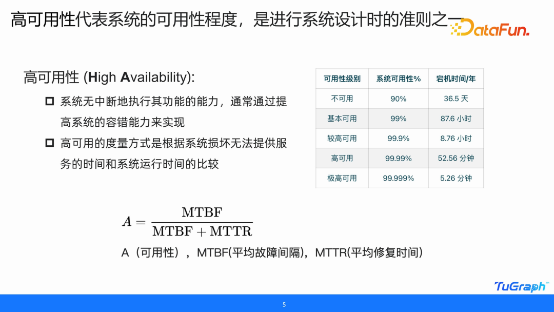 TuGraph-DB 对于可用性的要求,至少是 4 个 9 级别,也就是一年之内宕机时间不能超过 53 分钟。我们在开源之前服务的一个银行用户就已经达到了一个极高可用的等级,也就是 5 个 9 的等级。