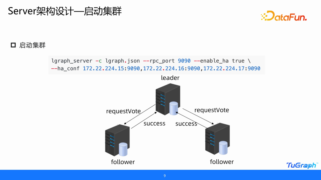 首先建立一个集群,启动集群的方式跟单机版几乎是一致的,只不过要加上 enable_ha 参数和 ha_conf 参数去指定集群里面所有节点的 URL,并且要保证三个或者五个节点是可以进行通信的。在三个节点同时启动后,最先启动的节点的计时器会超时,把自己选成一个候选者,之后向其它节点发送一个投票请求,其它节点接收到请求之后,会返回给候选者一个 success 的 response,当超过半数之后,这个 leader 就当选了。一般来说,在同城的情况下,延迟不会超过 2 毫秒,在两地的情况下,比如上海到深圳,最高延迟不会超过 30 毫秒,所以集群建立的时间和选举的时间是非常快的。