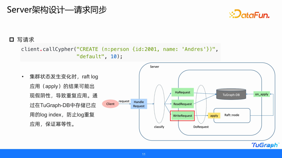 在高可用集群使用过程中,有很多不可预知的情况,比如正好在应用日志的时候,集群突然挂了或者突然重启了。即使这种情况发生的概率非常低,但在大规模应用中仍然有可能发生。因此,写请求必须是幂等的,请求的 log index 必须是一致的,当它应用到 DB 里时,不能产生重复的提交。所以我们在 DB 内部持有 log 的 index,当 client 由于超时重发或节点的状态发生变化而重复提交时,都不会对 DB 状态产生污染。