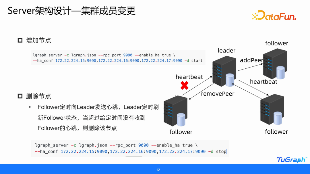 要删除节点时,可以直接调用下图中给出的命令,让节点离开集群。正常情况下是由 leader 向 follower 发送心跳,为了维护集群正常的状态,follower 也会向 leader 发送心跳,让 leader 感知到它的存在。当 follower 超过一定的时间没有给 leader 发送心跳时,就会把这个 follower 从集群中去除,从而完成了集群成员的变更。
