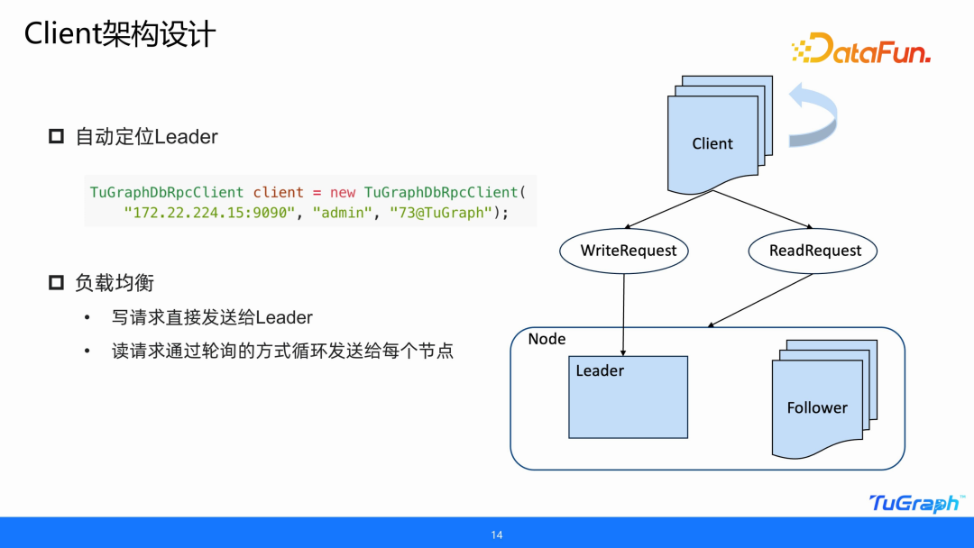 以上对 server 端的设计进行了介绍,接下来介绍 client 端的设计。Client 端最重要的有两点,第一点是 client 必须持有集群中所有节点的连接,不能只有一个节点。既然持有所有节点的连接,也就是连接池,那么它必须要知道谁是 leader,所以 client 必须要支持在连接上这个集群的时候,自动定位到 leader,通过这种方式,只需要去指定集群中任意一个节点的 URL,就可以连接上整个集群,并自动找到集群中的 leader。