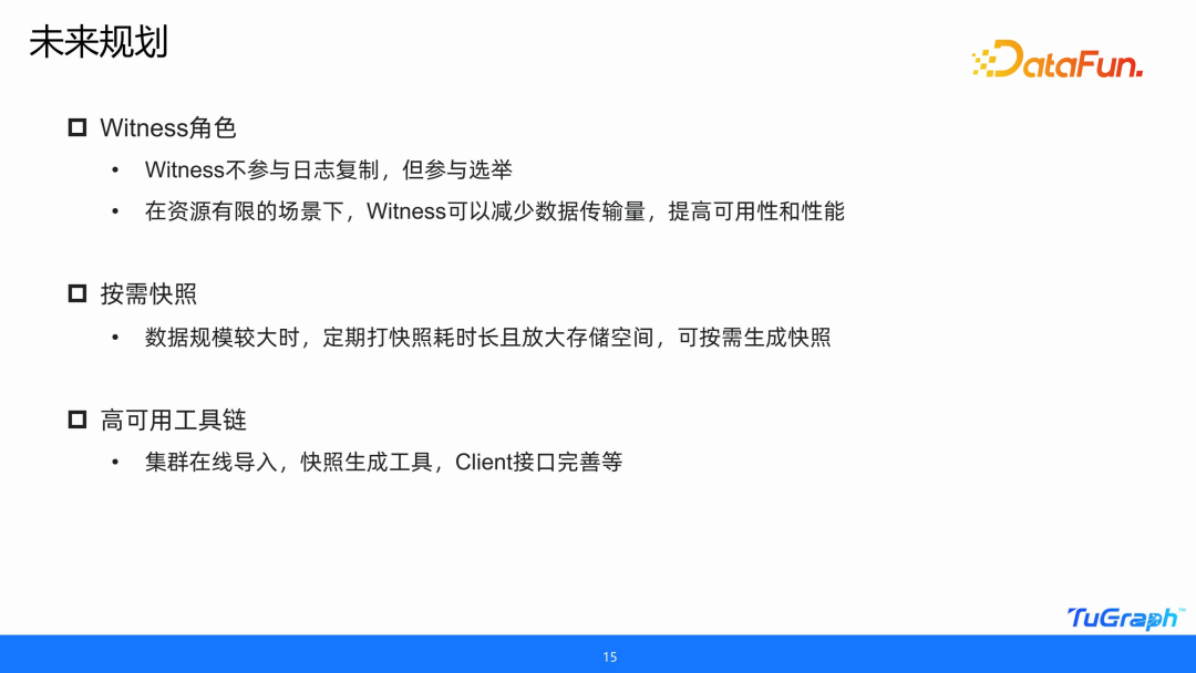 第三个是高可用工具链。因为 TuGraph-DB 的高可用功能是 3.6 版本才开源,它提供的工具链现在还有一些待完善的地方,比如在线导入,只提供了单机的功能,我们希望可以提供一个集群在线导入,这样就不用去对多机执行在线导入的功能了。还有快照生成工具,client 的接口完善等等。