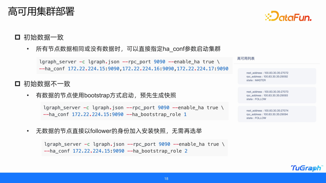 当原始数据一致的时候,可以直接指定 HA configure 参数启动集群。当初始数据不一致的时候,假如有一个节点有数据,其它节点没有数据,需要把数据同步到其它节点,但是又不能通过 SCP 传,那么就可以通过初始数据不一致的方式去启动。有数据的节点用 bootstrap 方式启动,预先生成一个快照,然后其它节点以 follower 的身份加入集群,加入集群时会安装快照,安装快照之后才会进行选举和 follower 身份的确认。