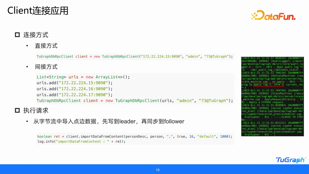 启动完集群之后,前端会有一个高可用的列表,client 有直接方式和间接方式连接的区别,主要是考虑到在亚马逊云部署和阿里云部署的区别。连接完了之后就可以去执行请求,比如执行写请求的时候,要先写到 leader 再同步到 follower,可以看到是有日志同步的。