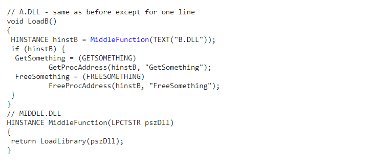 另请注意,DLL 之间存在的依赖关系不仅仅是对 LoadLibrary 的调用。例如,如果将回调函数指针传递给另一个 DLL,则就会创建一个反向依赖项。