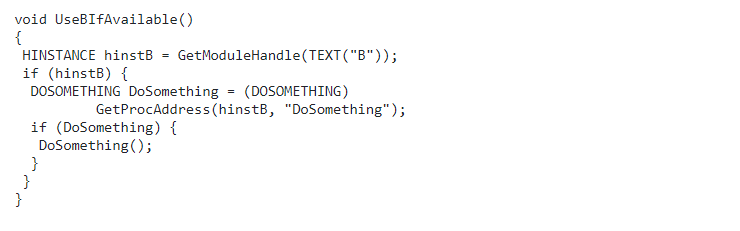 在标记为 “oops” 的行中,不能保证 B.DLL 仍在内存中,因为 B.DLL 不会出现在 A.DLL 的依赖项列表中,即使存在由对 LoadLibrary 的调用导致的运行时生成的动态依赖项。