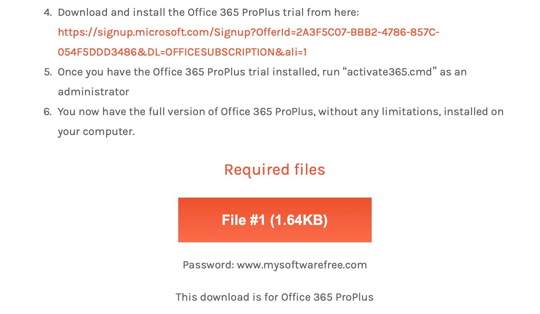 指示用户删除任何当前安装的WordPress模板Office,从Microsoft下载合法的免费试用版,然后从恶意网站上的按钮下载“所需文件”,以获取“完整版Office 365 ProPlus,而无需限制”。
