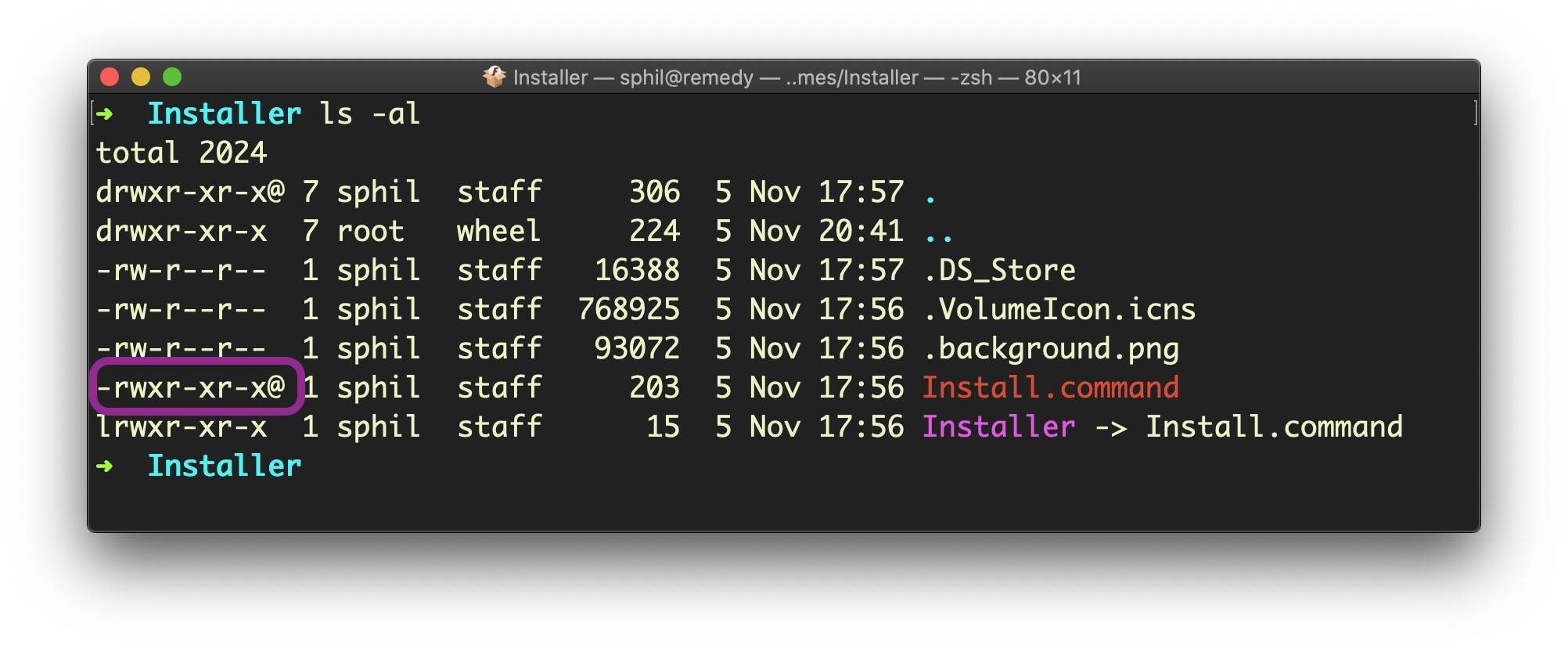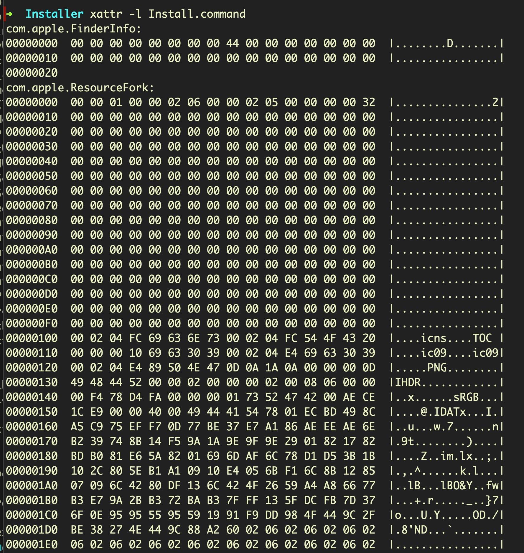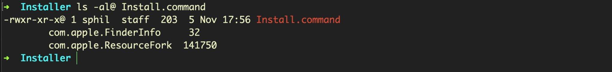 但是请注意,权限列表上的@是微小的203字节Install.command文件的权限。这表示该文件具有一些扩展属性,这就是使事情变得有趣的地方。