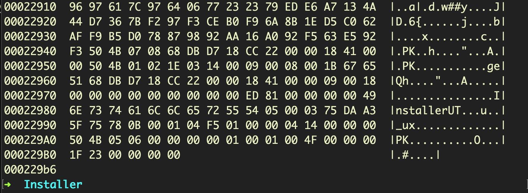 从偏移量9092开始,脚本通过密码为“oZwb”的funzip实用程序对派生中的数据进行管道传输,以解密数据,并将其放入带有前缀为“Installer”的随机名称的Darwin用户TMPDIR中。