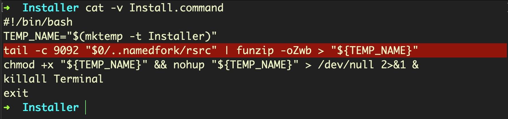 使用资源派生来隐藏恶意软件是我们以前从未见过的一种非常新奇的技术,但对它的研究还不是很深入,即参与者使用这种技术的目的是什么。尽管通过这种方式压缩二进制文件对查找器和终端都是隐藏的,但正如我们所看到的,只要阅读Install.command shell脚本,任何人都可以很容易地找到它。