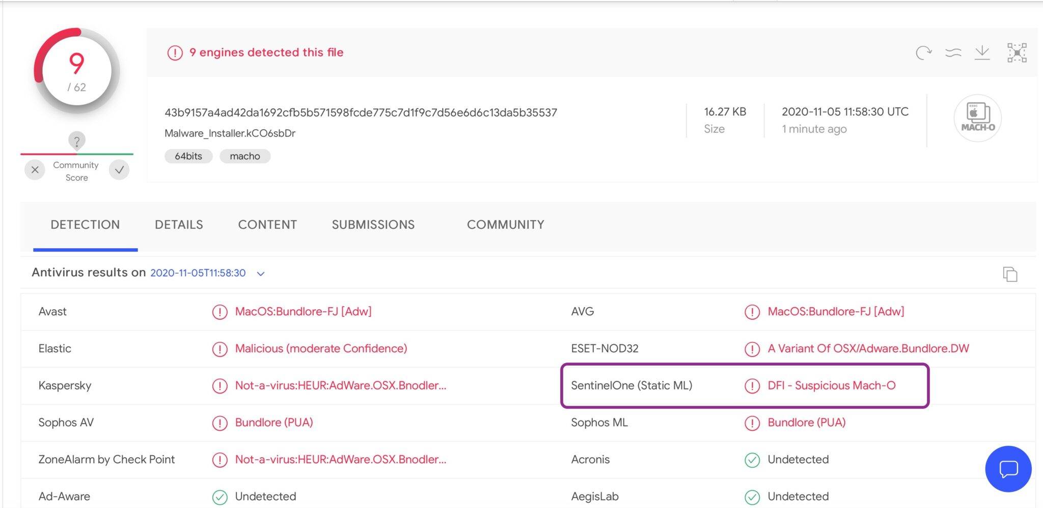 快速查看VirusTotal可以发现SentinelOne的静态AI (DFI)引擎将其识别为恶意文件,并被某些供应商标记为Bundlore变体。