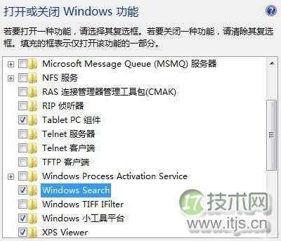在随后打开的对话框中,找到并勾选“Windows Serach”