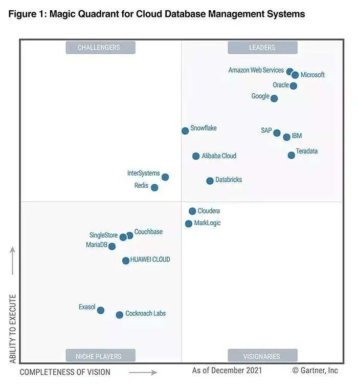 去年 12 月,权威咨询机构 Gartner 发布了报告——2021 Gartner Magic Quadrant for Cloud Database Management System。亚马逊云科技连续七年被评为云数据库领导者,在“执行能力”上获得 20 家参评厂商的最高位置。