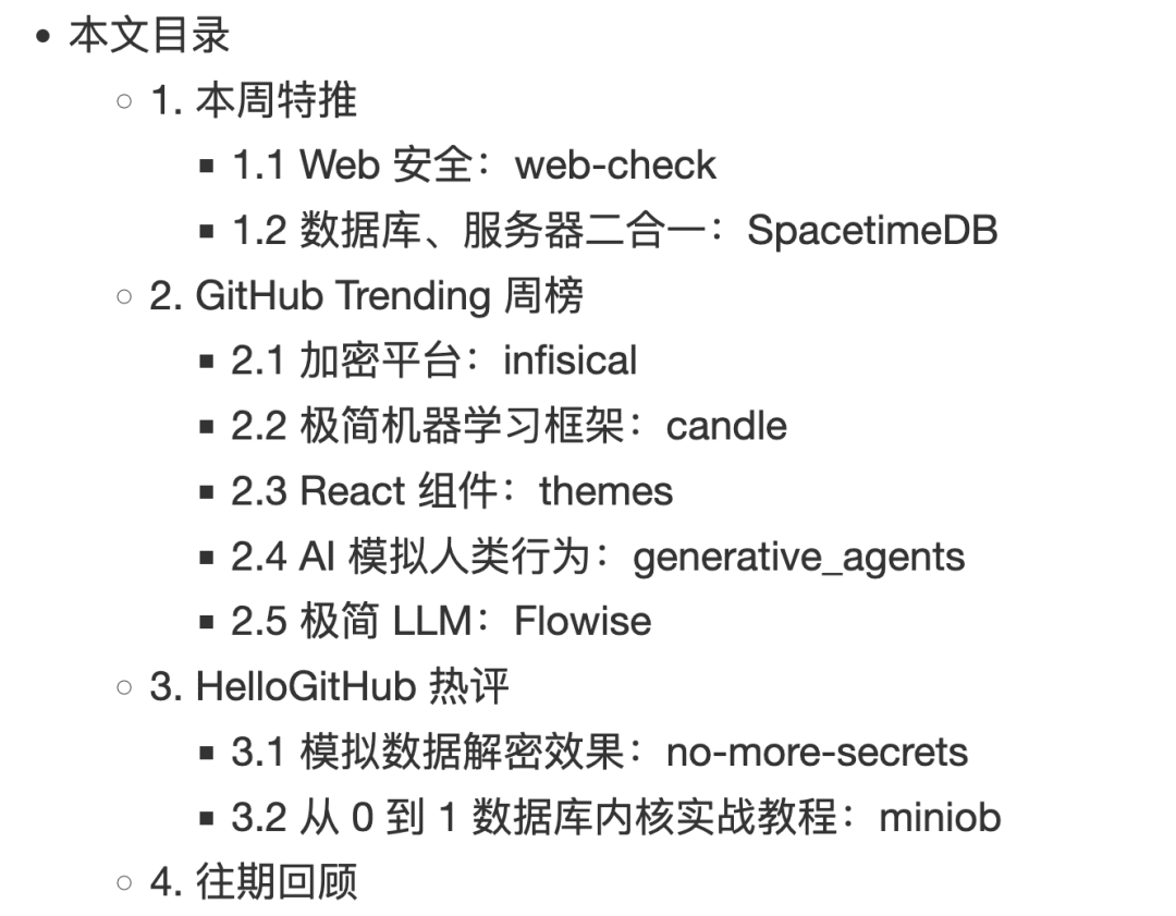 以下内容摘录自微博@HelloGitHub 的极简 GitHub Trending 及 Hacker News 热帖(简称 HN 热帖),选项标准:新发布 | 实用 | 有趣,工作根据项目 release 时间分类,流学发布时间不超过 14 day 的项目会标注 New,无该标志则说明项目 release 超过半月。由于本文篇幅有限,还有部分项目未能在本文展示,望周知 🌝