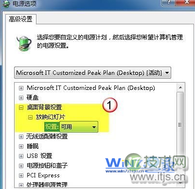 5、进入高级设置窗口之后,在下方展开“桌面背景设置-放映幻灯片”,然后将其设置为“可用”即可。