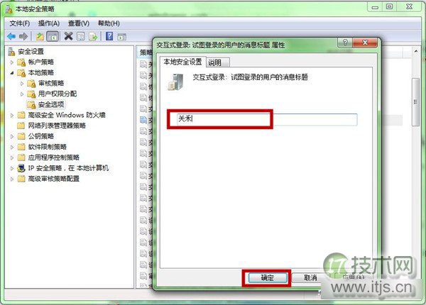 第四步、在“交互式登录:试图登录的用户的消息标题 属性”窗口中,我们输入标题内容,比如你的签名,然后按“确定”保存。