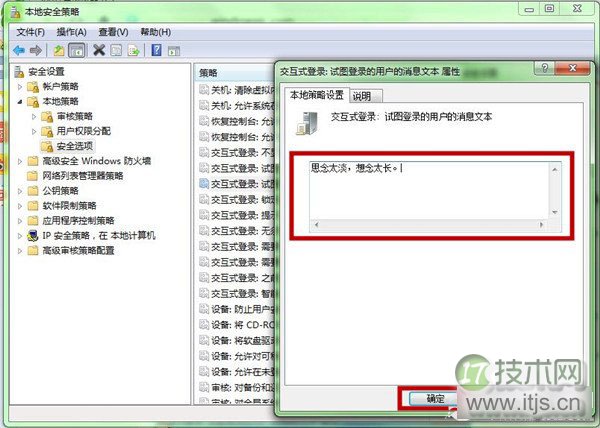 第六步、在“交互式登录:试图登录的用户的消息文本 属性”窗口中,你可以输入准备好的消息文本,然后按“确定”保存。