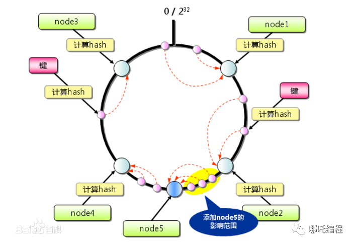 当增加一台新的服务器,受影响的数据仅仅是新添加的服务器到其环空间中前一台的服务器(也就是顺着逆时针方向遇到的第一台服务器)之间的数据,其他都不会受到影响。