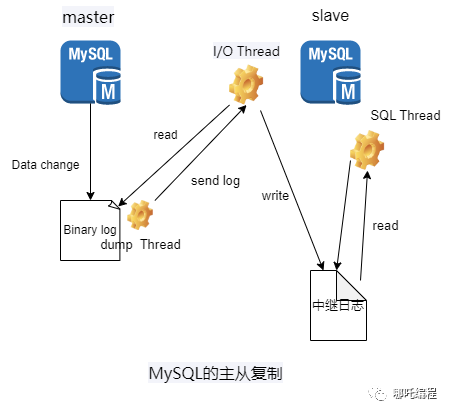 3、同时 master 主服务器为每个 I/O Thread 启动一个dump Thread,用于向其发送二进制事件日志。