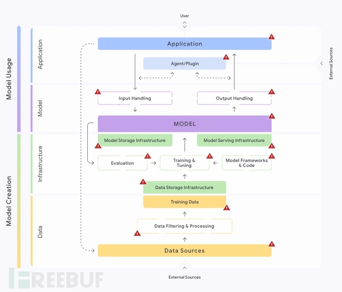 应用层:直接面向用户(如客服机器人)或内部服务的功能载体,具备工具执行能力时称为 “代理”。代理 / 插件:调用外部服务完成特定任务的模块,每次调用可能引入链式风险(如第三方数据接口漏洞)。三、SAIF地图风险详解及缓解措施
