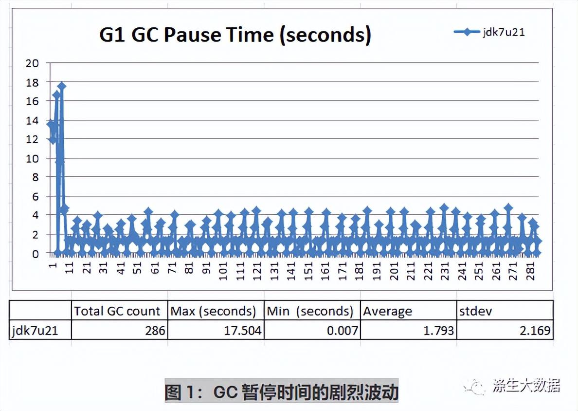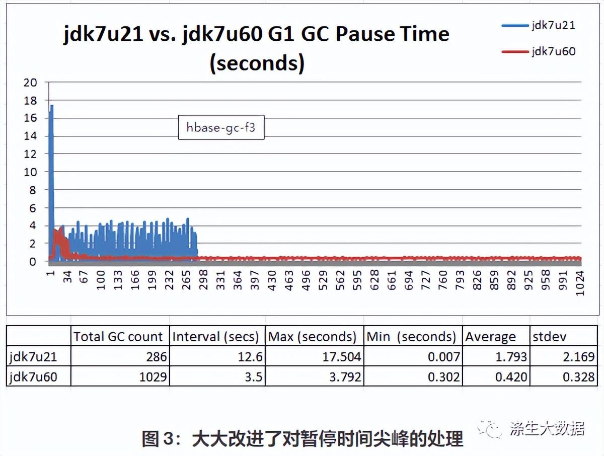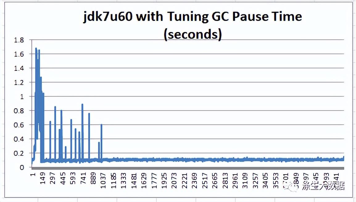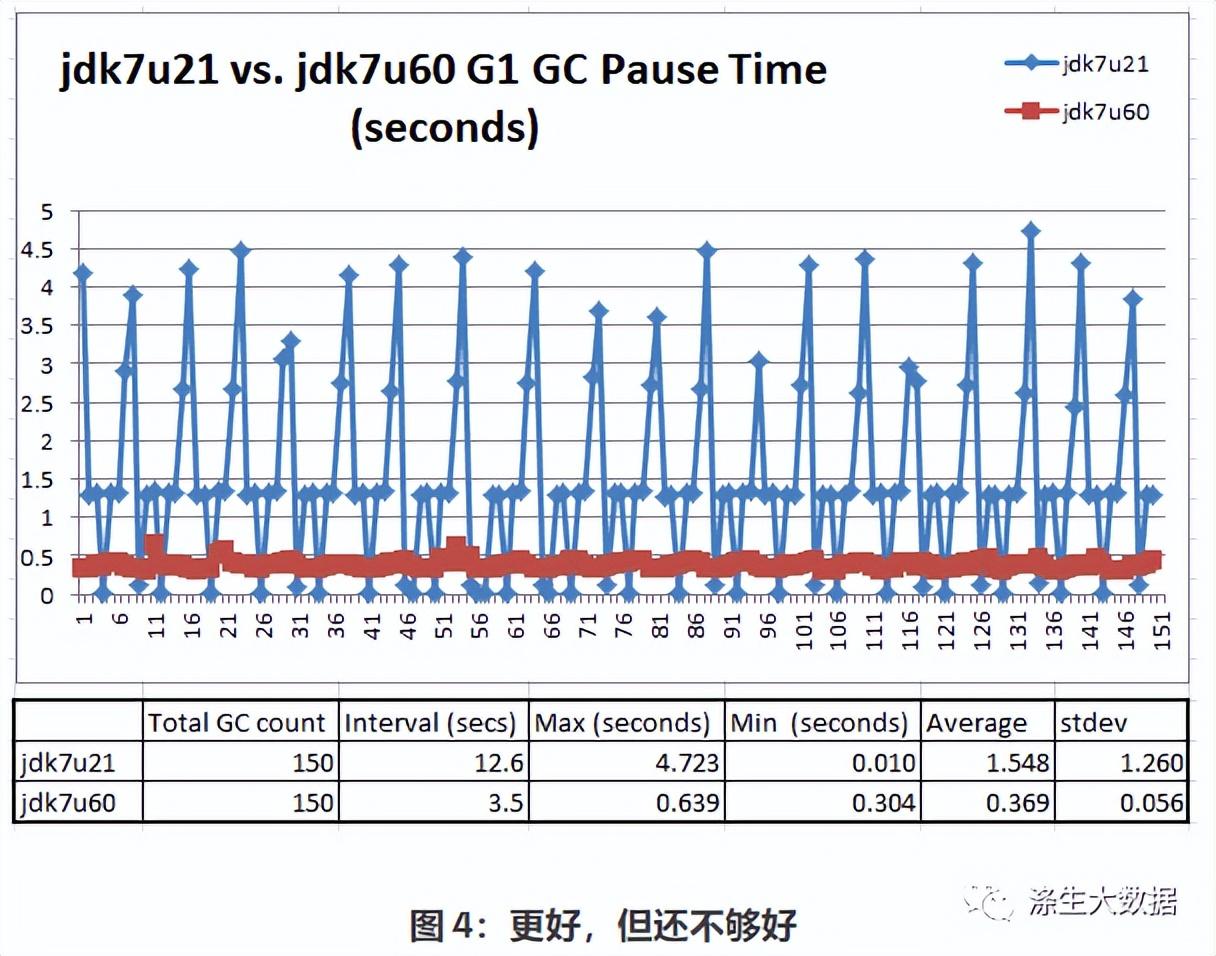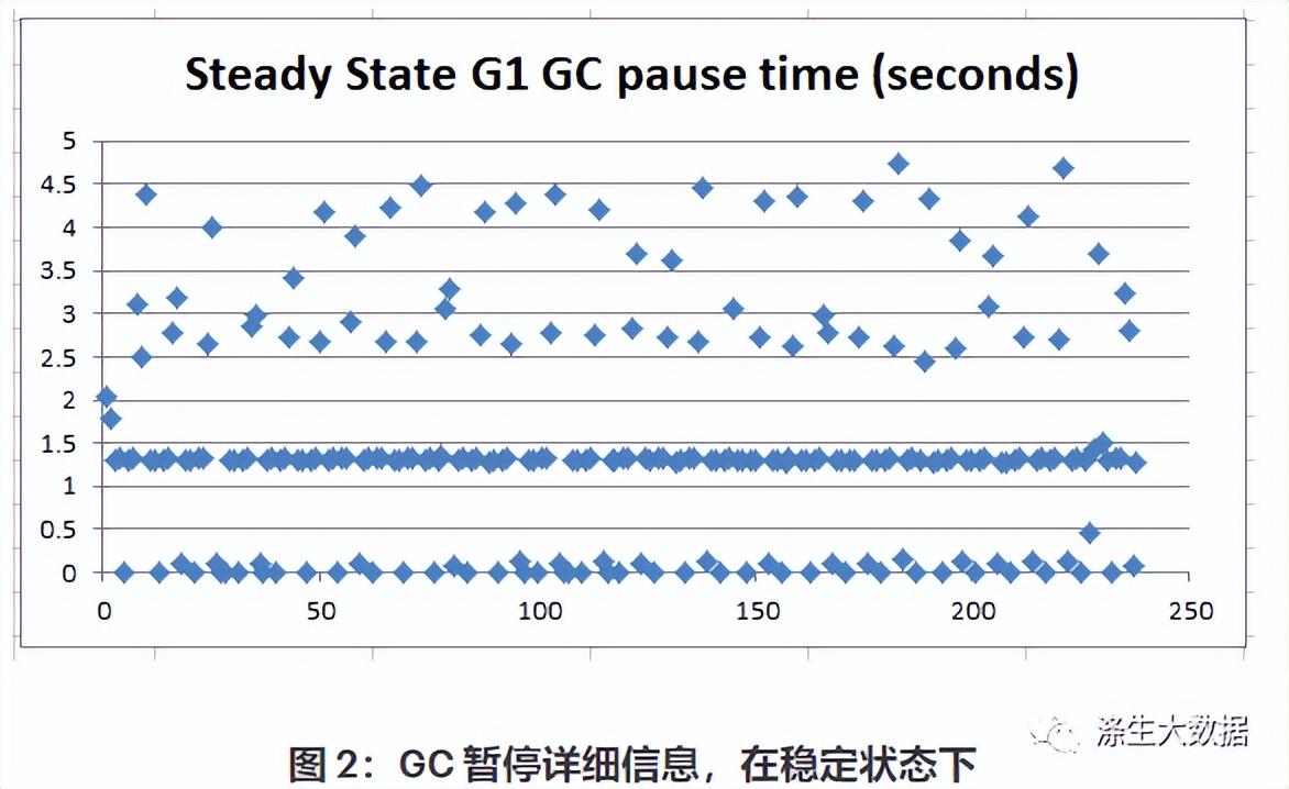 图 2 告诉我们 GC 暂停实际上分为三个不同的组:(1) 在 1 到 1.5 秒之间;(1) 在 1 到 1.5 秒之间;(2) 0.007秒至0.5秒之间;(3) 尖峰在 1.5 秒到 5 秒之间。这很奇怪,所以我们测试了最近发布的jdk7u60,看看数据是否有任何不同: 我们使用完全相同的 JVM 参数运行相同的 100% 读取测试:.-XX:+UseG1GC -Xms100g -Xmx100g -XX:MaxGCPauseMillis=100