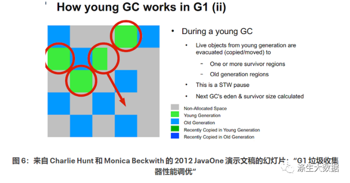 如图 6 所示,Java 程序使用 Java API 分配的每个对象首先进入左侧年轻代的 Eden 空间。一段时间后,Eden 变满,触发了 Young generation GC。仍然被引用(即“活着”)的对象被复制到 Survivor 空间。当对象在年轻代中存活了几次 GC 后,它们就会被提升到老年代空间。当 Young GC 发生时,Java 应用程序的线程会停止,以便安全地标记和复制活动对象。这些停止是臭名昭著的“停止世界”GC 暂停,这使得应用程序在暂停结束之前没有响应。