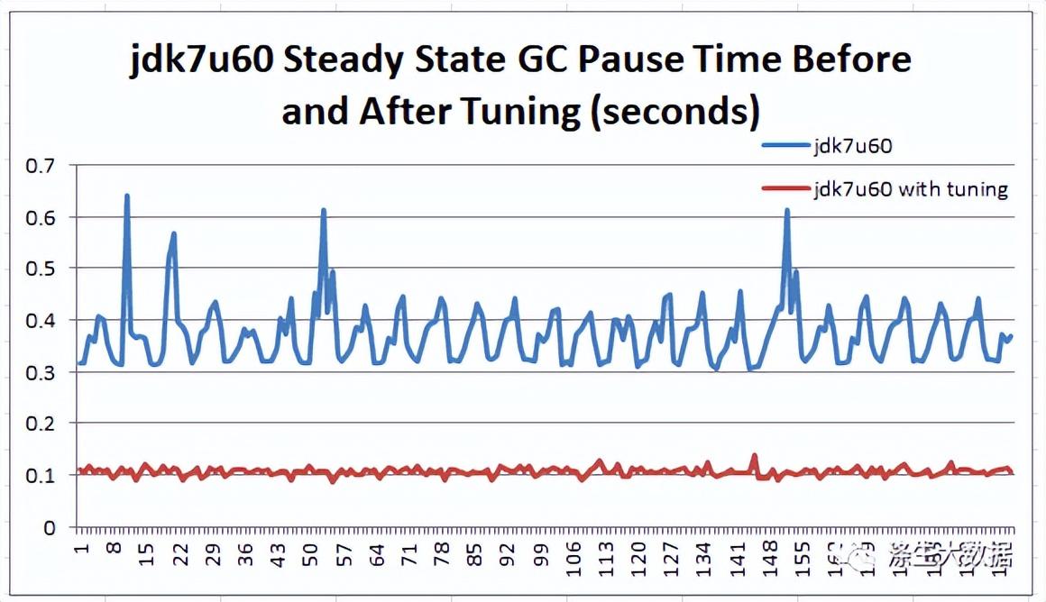 在此图表中,即使是最高的初始稳定峰值也从 3.792 秒减少到 1.684 秒。最开始的峰值不到 1 秒。结算后,GC 能够将暂停时间保持在 100 毫秒左右。下图比较了 jdk7u60 在稳定状态下使用和不使用调优的运行情况: