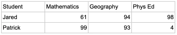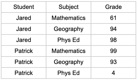 复制SELECT Student, MATHEMATICS, GEOGRAPHY, PHYS_ED                        FROM ( SELECT Student, Grade, Subject FROM skool)                        PIVOT ( AVG ( Grade ) FOR Subject IN ( Mathematics, Geography, Phys Ed ) ) as p                        ( Student, MATHEMATICS, GEOGRAPHY, PHYS_ED );1.2.3.4.