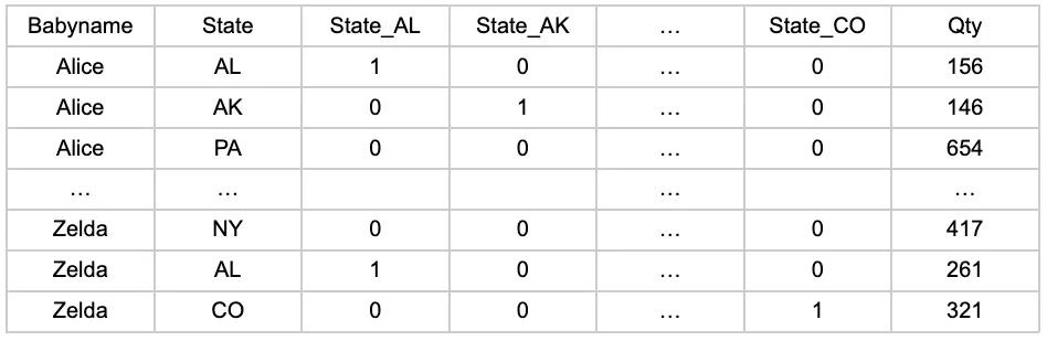 复制SELECT *,                        CASE WHEN State = AL THEN 1 ELSE 0 END as STATE_AL,                        CASE WHEN State = AK THEN 1 ELSE 0 END as STATE_AK,                        CASE WHEN State = AZ THEN 1 ELSE 0 END as STATE_AZ,                        CASE WHEN State = AR THEN 1 ELSE 0 END as STATE_AR,                        CASE WHEN State = AS THEN 1 ELSE 0 END as STATE_AS,                        CASE WHEN State = CA THEN 1 ELSE 0 END as STATE_CA,                        CASE WHEN State = CO THEN 1 ELSE 0 END as STATE_CO,                        CASE WHEN State = CT THEN 1 ELSE 0 END as STATE_CT,                        CASE WHEN State = DC THEN 1 ELSE 0 END as STATE_DC,                        CASE WHEN State = FL THEN 1 ELSE 0 END as STATE_FL,                        CASE WHEN State = GA THEN 1 ELSE 0 END as STATE_GA,                        CASE WHEN State = HI THEN 1 ELSE 0 END as STATE_HI,                        CASE WHEN State = ID THEN 1 ELSE 0 END as STATE_ID,                        CASE WHEN State = IL THEN 1 ELSE 0 END as STATE_IL,                        CASE WHEN State = IN THEN 1 ELSE 0 END as STATE_IN,                        CASE WHEN State = IA THEN 1 ELSE 0 END as STATE_IA,                        CASE WHEN State = KS THEN 1 ELSE 0 END as STATE_KS,                        CASE WHEN State = KY THEN 1 ELSE 0 END as STATE_KY,                        CASE WHEN State = LA THEN 1 ELSE 0 END as STATE_LA,                        CASE WHEN State = ME THEN 1 ELSE 0 END as STATE_ME,                        CASE WHEN State = MD THEN 1 ELSE 0 END as STATE_MD,                        CASE WHEN State = MA THEN 1 ELSE 0 END as STATE_MA,                        CASE WHEN State = MI THEN 1 ELSE 0 END as STATE_MI,                        CASE WHEN State = MN THEN 1 ELSE 0 END as STATE_MN,                        CASE WHEN State = MS THEN 1 ELSE 0 END as STATE_MS,                        CASE WHEN State = MO THEN 1 ELSE 0 END as STATE_MO,                        CASE WHEN State = MT THEN 1 ELSE 0 END as STATE_MT,                        CASE WHEN State = NE THEN 1 ELSE 0 END as STATE_NE,                        CASE WHEN State = NV THEN 1 ELSE 0 END as STATE_NV,                        CASE WHEN State = NH THEN 1 ELSE 0 END as STATE_NH,                        CASE WHEN State = NJ THEN 1 ELSE 0 END as STATE_NJ,                        CASE WHEN State = NM THEN 1 ELSE 0 END as STATE_NM,                        CASE WHEN State = NY THEN 1 ELSE 0 END as STATE_NY,                        CASE WHEN State = NC THEN 1 ELSE 0 END as STATE_NC,                        CASE WHEN State = ND THEN 1 ELSE 0 END as STATE_ND,                        CASE WHEN State = OH THEN 1 ELSE 0 END as STATE_OH,                        CASE WHEN State = OK THEN 1 ELSE 0 END as STATE_OK,                        CASE WHEN State = OR THEN 1 ELSE 0 END as STATE_OR,                        CASE WHEN State = PA THEN 1 ELSE 0 END as STATE_PA,                        CASE WHEN State = RI THEN 1 ELSE 0 END as STATE_RI,                        CASE WHEN State = SC THEN 1 ELSE 0 END as STATE_SC,                        CASE WHEN State = SD THEN 1 ELSE 0 END as STATE_SD,                        CASE WHEN State = TN THEN 1 ELSE 0 END as STATE_TN,                        CASE WHEN State = TX THEN 1 ELSE 0 END as STATE_TX,                        CASE WHEN State = UT THEN 1 ELSE 0 END as STATE_UT,                        CASE WHEN State = VT THEN 1 ELSE 0 END as STATE_VT,                        CASE WHEN State = VA THEN 1 ELSE 0 END as STATE_VA,                        CASE WHEN State = WA THEN 1 ELSE 0 END as STATE_WA,                        CASE WHEN State = WV THEN 1 ELSE 0 END as STATE_WV,                        CASE WHEN State = WI THEN 1 ELSE 0 END as STATE_WI,                        CASE WHEN State = WY THEN 1 ELSE 0 END as STATE_WY                        FROM BABYTABLE;1.2.3.4.5.6.7.8.9.10.11.12.13.14.15.16.17.18.19.20.21.22.23.24.25.26.27.28.29.30.31.32.33.34.35.36.37.38.39.40.41.42.43.44.45.46.47.48.49.50.51.52.53.