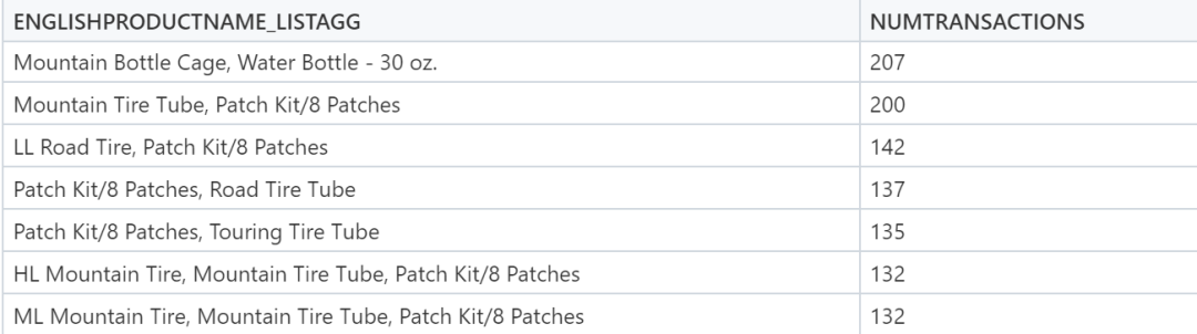 复制WITH order_detail as (                        SELECT                        SALESORDERNUMBER,                        listagg(ENGLISHPRODUCTNAME, , ) WITHIN group (                        order by                        ENGLISHPRODUCTNAME                        ) as ENGLISHPRODUCTNAME_listagg,                        COUNT(ENGLISHPRODUCTNAME) as num_products                        FROM                        transactions                        GROUP BY                        SALESORDERNUMBER                        )                        SELECT                        ENGLISHPRODUCTNAME_listagg,                        count(SALESORDERNUMBER) as NumTransactions                        FROM                        order_detail                        where                        num_products > 1                        GROUP BY                        ENGLISHPRODUCTNAME_listagg                        order by                        count(SALESORDERNUMBER) desc;1.2.3.4.5.6.7.8.9.10.11.12.13.14.15.16.17.18.19.20.21.22.23.24.