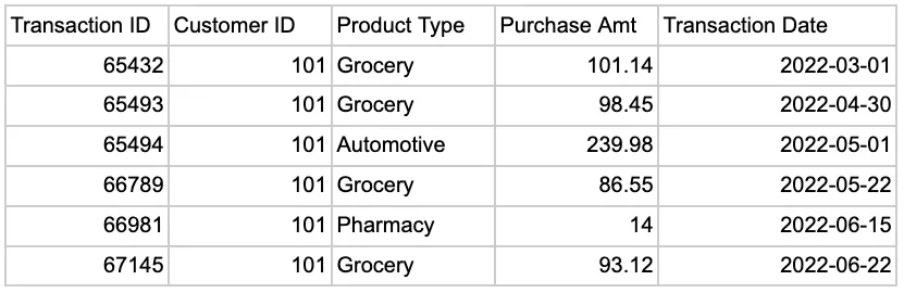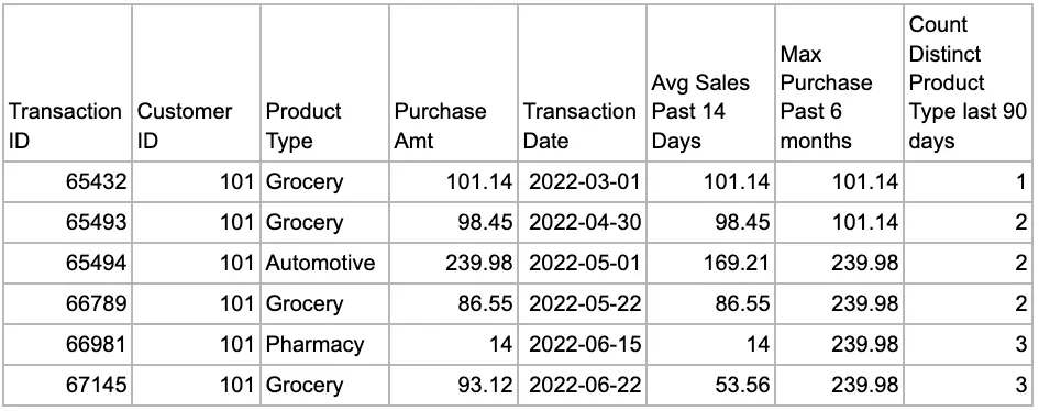 复制WITH BASIC_OFFSET_14DAY AS (                        SELECT                        A.CustomerID,                        A.TransactionDate,                        AVG(B.PurchaseAmount) as AVG_PURCHASEAMOUNT_PAST14DAY,                        MAX(B.PurchaseAmount) as MAX_PURCHASEAMOUNT_PAST14DAY,                        COUNT(DISTINCT B.TransactionID) as COUNT_DISTINCT_TRANSACTIONID_PAST14DAY                        FROM                        My_First_Table A                        INNER JOIN My_First_Table B ON A.CustomerID = B.CustomerID                        AND 1 = 1                        WHERE                        B.TransactionDate >= DATEADD(day, -14, A.TransactionDate)                        AND B.TransactionDate <= A.TransactionDate                        GROUP BY                        A.CustomerID,                        A.TransactionDate                        ),                        BASIC_OFFSET_90DAY AS (                        SELECT                        A.CustomerID,                        A.TransactionDate,                        AVG(B.PurchaseAmount) as AVG_PURCHASEAMOUNT_PAST90DAY,                        MAX(B.PurchaseAmount) as MAX_PURCHASEAMOUNT_PAST90DAY,                        COUNT(DISTINCT B.TransactionID) as COUNT_DISTINCT_TRANSACTIONID_PAST90DAY                        FROM                        My_First_Table A                        INNER JOIN My_First_Table B ON A.CustomerID = B.CustomerID                        AND 1 = 1                        WHERE                        B.TransactionDate >= DATEADD(day, -90, A.TransactionDate)                        AND B.TransactionDate <= A.TransactionDate                        GROUP BY                        A.CustomerID,                        A.TransactionDate                        ),                        BASIC_OFFSET_180DAY AS (                        SELECT                        A.CustomerID,                        A.TransactionDate,                        AVG(B.PurchaseAmount) as AVG_PURCHASEAMOUNT_PAST180DAY,                        MAX(B.PurchaseAmount) as MAX_PURCHASEAMOUNT_PAST180DAY,                        COUNT(DISTINCT B.TransactionID) as COUNT_DISTINCT_TRANSACTIONID_PAST180DAY                        FROM                        My_First_Table A                        INNER JOIN My_First_Table B ON A.CustomerID = B.CustomerID                        AND 1 = 1                        WHERE                        B.TransactionDate >= DATEADD(day, -180, A.TransactionDate)                        AND B.TransactionDate <= A.TransactionDate                        GROUP BY                        A.CustomerID,                        A.TransactionDate                        )                        SELECT                        src.*,                        BASIC_OFFSET_14DAY.AVG_PURCHASEAMOUNT_PAST14DAY,                        BASIC_OFFSET_14DAY.MAX_PURCHASEAMOUNT_PAST14DAY,                        BASIC_OFFSET_14DAY.COUNT_DISTINCT_TRANSACTIONID_PAST14DAY,                        BASIC_OFFSET_90DAY.AVG_PURCHASEAMOUNT_PAST90DAY,                        BASIC_OFFSET_90DAY.MAX_PURCHASEAMOUNT_PAST90DAY,                        BASIC_OFFSET_90DAY.COUNT_DISTINCT_TRANSACTIONID_PAST90DAY,                        BASIC_OFFSET_180DAY.AVG_PURCHASEAMOUNT_PAST180DAY,                        BASIC_OFFSET_180DAY.MAX_PURCHASEAMOUNT_PAST180DAY,                        BASIC_OFFSET_180DAY.COUNT_DISTINCT_TRANSACTIONID_PAST180DAY                        FROM                        My_First_Table src                        LEFT OUTER JOIN BASIC_OFFSET_14DAY ON BASIC_OFFSET_14DAY.TransactionDate = src.TransactionDate                        AND BASIC_OFFSET_14DAY.CustomerID = src.CustomerID                        LEFT OUTER JOIN BASIC_OFFSET_90DAY ON BASIC_OFFSET_90DAY.TransactionDate = src.TransactionDate                        AND BASIC_OFFSET_90DAY.CustomerID = src.CustomerID                        LEFT OUTER JOIN BASIC_OFFSET_180DAY ON BASIC_OFFSET_180DAY.TransactionDate = src.TransactionDate                        AND BASIC_OFFSET_180DAY.CustomerID = src.CustomerID;1.2.3.4.5.6.7.8.9.10.11.12.13.14.15.16.17.18.19.20.21.22.23.24.25.26.27.28.29.30.31.32.33.34.35.36.37.38.39.40.41.42.43.44.45.46.47.48.49.50.51.52.53.54.55.56.57.58.59.60.61.62.63.64.65.66.67.68.69.70.71.72.73.
